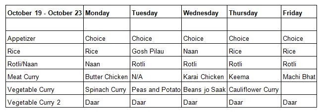 We've attached our menu starting, Monday, October 19th for our tiffin service.